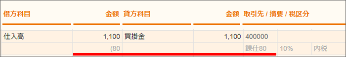 税区分を「課仕80控」にすると、消費税額(控除対象額)が80になります。