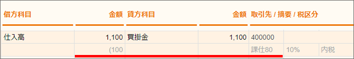 【例】税区分「課対仕入」で「金額:1100」「消費税(内税):100」の仕訳の場合