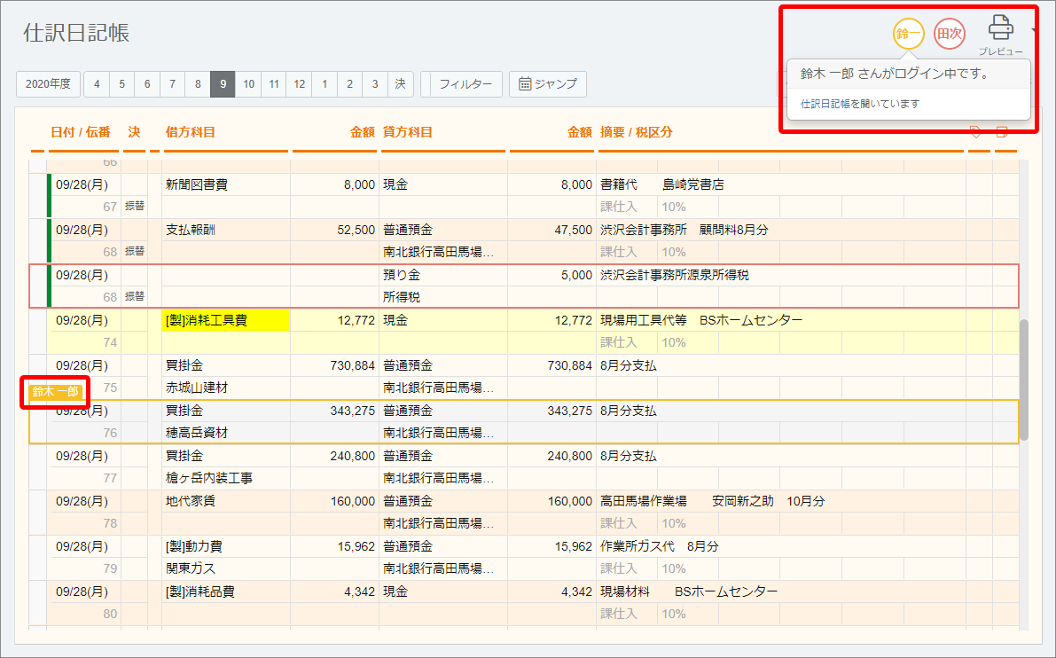 また、帳簿、試算表、集計表では他のメンバーが入力(操作)している位置には枠が表示されます。